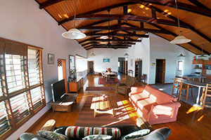 The huge open plan kitchen / dining and lounge area has 5-metre high open beamed ceiling and polished wooden floorboards and large windows with sweeping views towards the ocean and enjoys cool sea breezes.