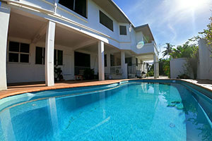 The executive upstairs is available to host short-term stays as a 2-bedroom house for rent on a one to six month contract. The upstairs offers outstanding luxury living for expatriate couples with two bedrooms. The majority of the living space is open plan lounge / dining / kitchen / office space with an imposing high exposed beam ceiling and a massive screened veranda boasting ocean and sunset views.