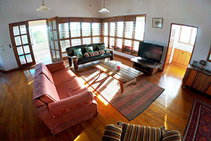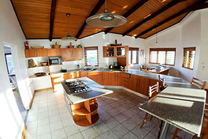 The huge open plan kitchen / dining and lounge area has 5-metre high open beamed ceiling and polished wooden floorboards and large windows with sweeping views towards the ocean and enjoys cool sea breezes.
